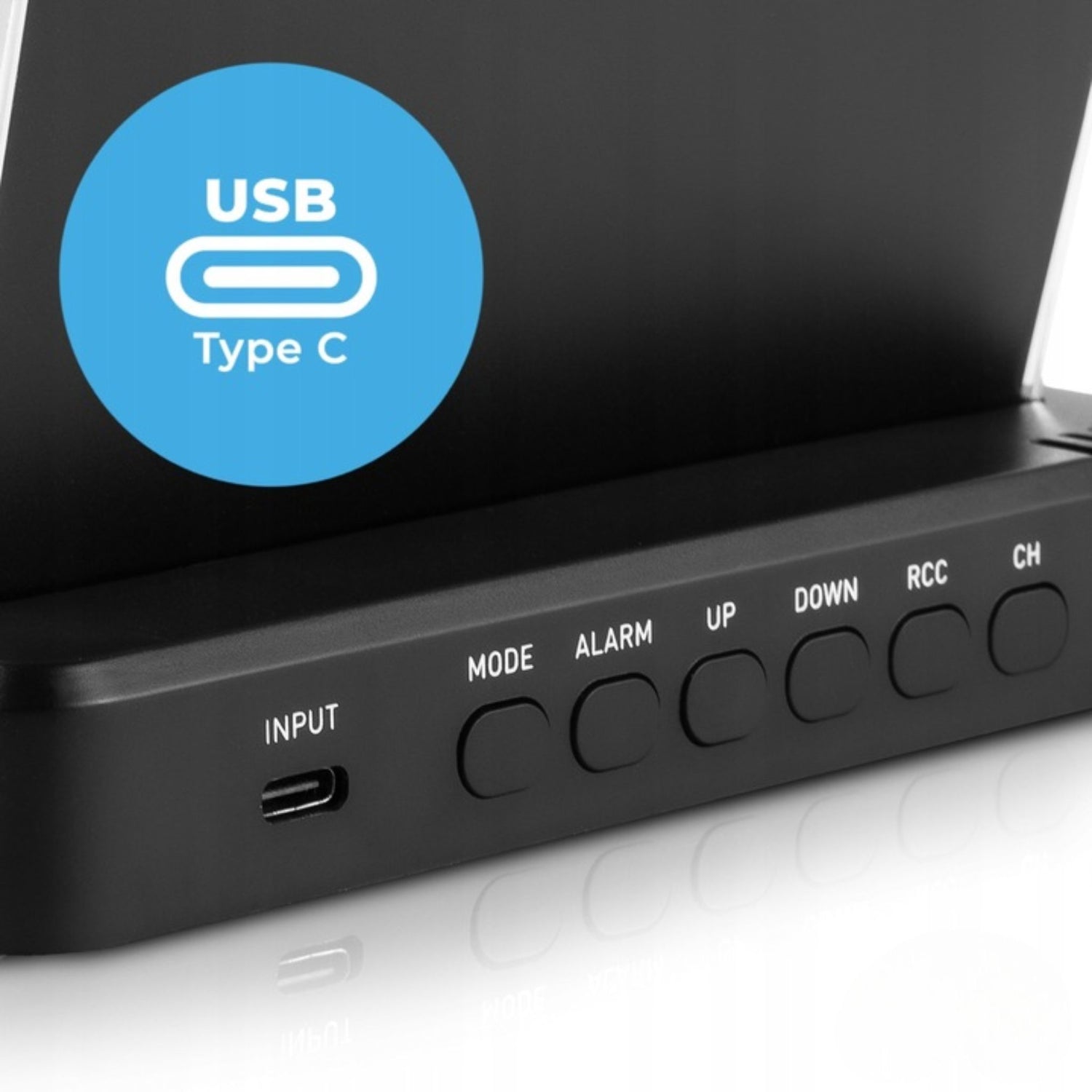 - ALARM – Włączanie/wyłączanie alarmu; długie naciśnięcie otwiera ustawienia godziny alarmu